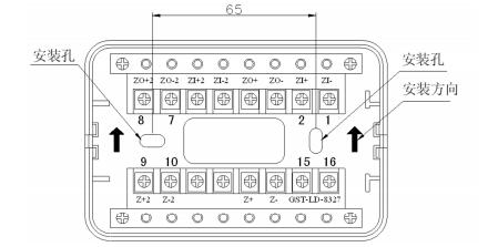 本接口的外形尺寸及結構與 GST-LD-8302 型切換模塊相同,安裝方法也相同,底座端子示意圖
