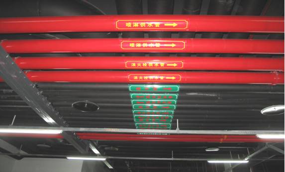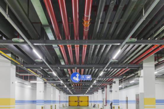 車庫管線排布美觀,聯合支吊架安全可靠,管道居套管中,燈帶線槽平直,噴淋布置間距一致,標識清晰。