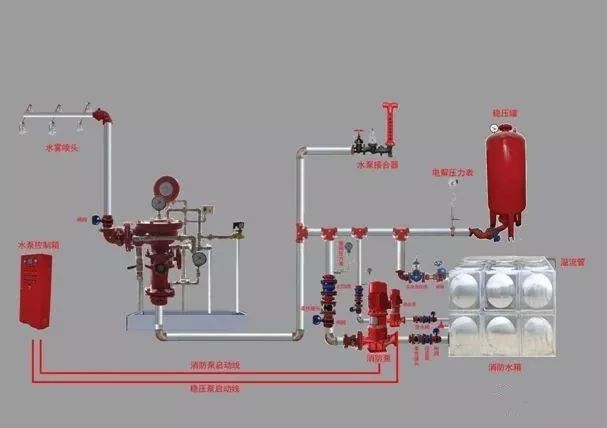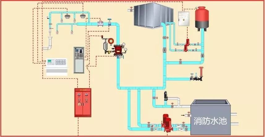 1、消防水池、消防水泵、水泵接合器、消防水箱(參見消火栓系統)。用氣壓罐代替高位消防水箱,消防水箱的出水管未與報警閥前的管道連接。