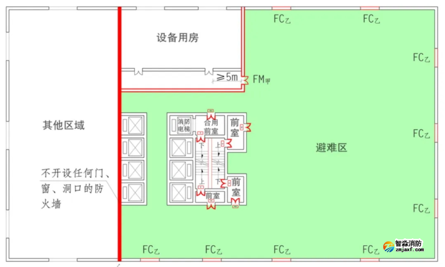 原則上,當避難層的避難區和設備用房的面積較小時,可將避難層的局部區域作為其他功能,但應采用不開設任何洞口的防火墻分隔,避難區應至少有兩個面靠外墻,參見【圖示】。在實際應用中,這種處理方式主要適應于住宅建筑,說明如下: